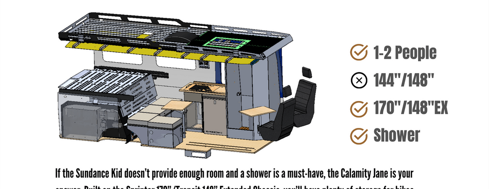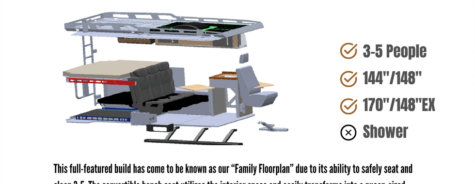 Many van builders offer a variety of options and upgrades and Off Highway Van is no exception. We begin by establishing which general layout/floorplan will meet your needs and begin customizing from there. Our floorplans are based three basic criteria: seating and sleeping, an internal shower, and van size. Use the gallery below to quickly glance through our floorplans and determine which model works best for you.